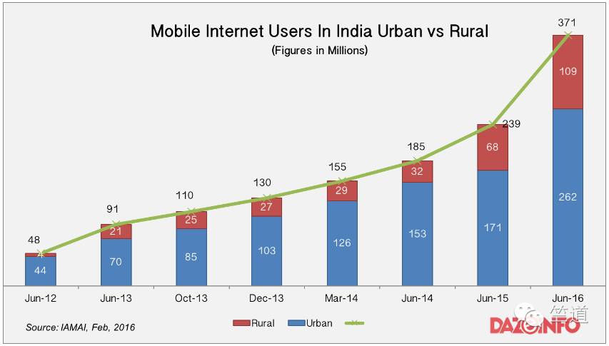 印度城乡地区普遍缺少互联网服务,使得印度城乡地区的互联网用户规模过小。印度网络及移动通信协会(IAMAI)2015年8月份发布的一份报告指出,印度拥有1.88亿城市互联网用户,而乡村用户只有4600万。