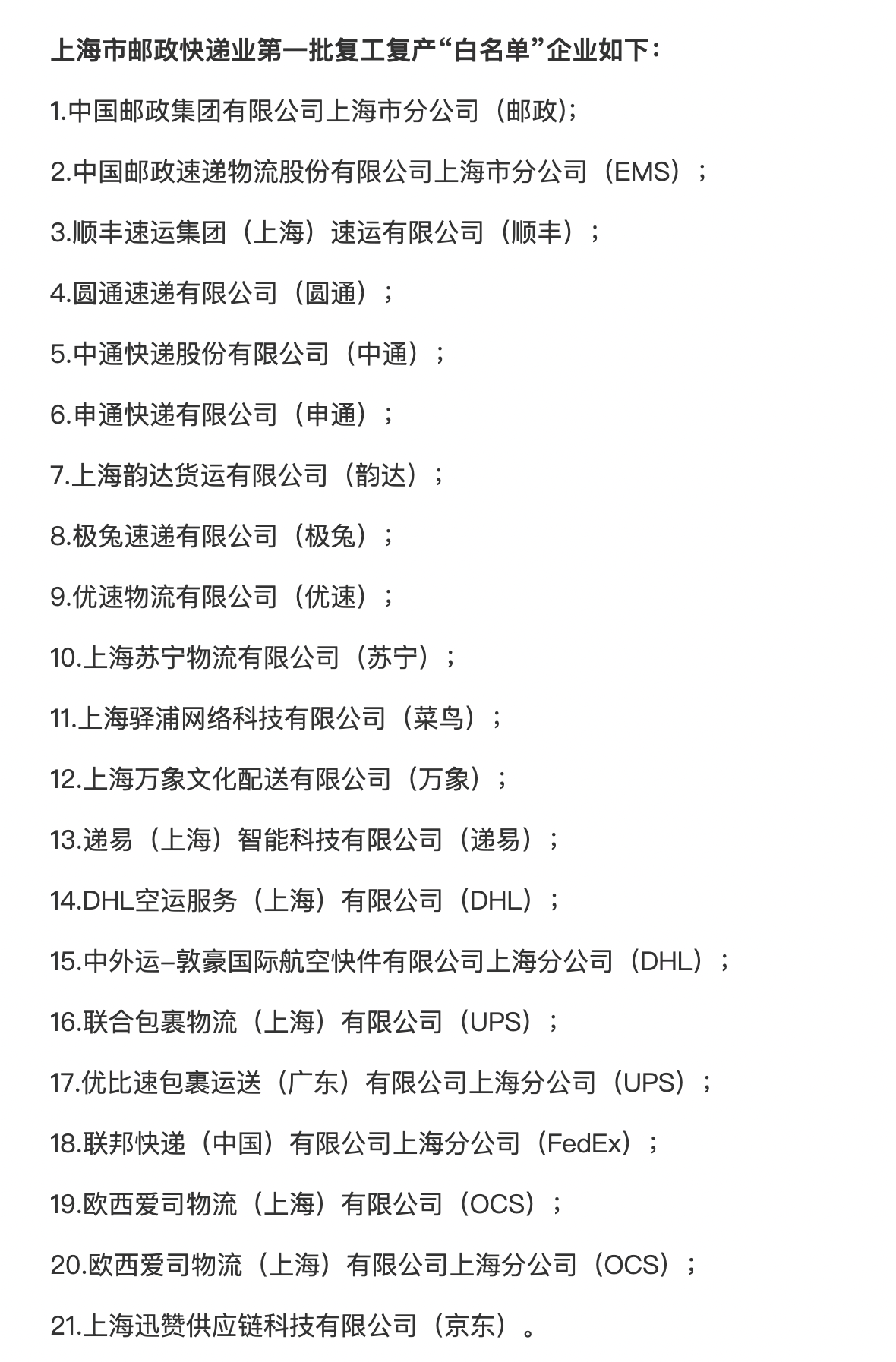 5月7日,上海市邮政管理局公布了上海市邮政快递业第一批复工复产“白名单”企业,邮政、顺丰、圆通、中通、申通、韵达、极兔、优速、京东以及DHL、UPS、FedEx等21家企业在列。