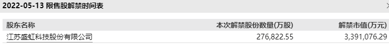 根据计划,东方盛虹5月13日将有27.68亿股定增限售股上市流通,占总股本比例46.55%,是解禁前流通盘的1.34倍,约合解禁市值339.11亿元。此次解禁涉及股东只有一家,为第一大股东江苏盛虹科技股份有限公司。