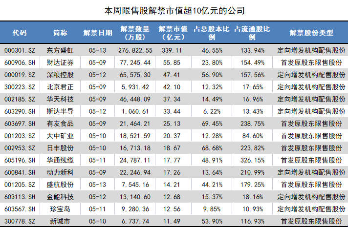 解禁市值超过10亿元的上市公司共计有15家,除东方盛虹外,财达证券、深粮控股、北京君正(300223.SZ)解禁市值均超过40亿元。