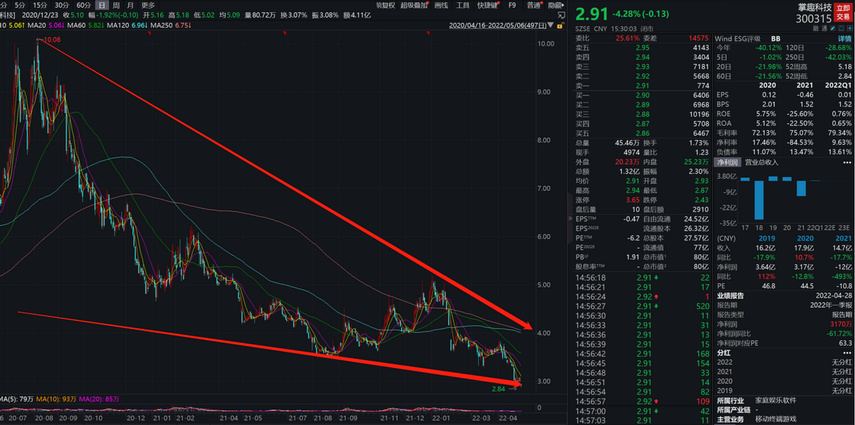 4月27日,掌趣科技发布2021年年报以及2022年第一季度财报。“差劲”的业绩表现引发投资者的不满,反映在资本市场上,掌趣科技股价持续暴跌,年报发布当日报收3.07元/股,盘中更是下探至2.84元/股,跌出新高度,再创历史新低。