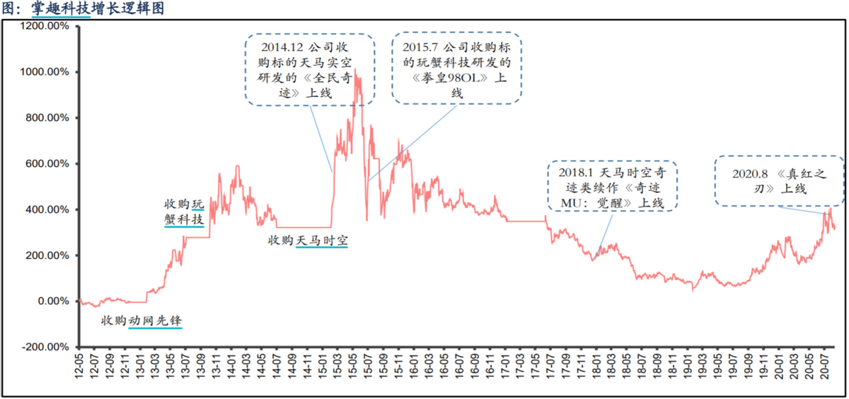 2013年2月,掌趣科技以8.1亿元收购海南动网先锋网络科技有限公司(下称“动网先锋”)100%股权;同年10月以25.53亿元收购北京玩蟹科技有限公司(下称“玩蟹科技”)100%股权及上游信息科技(上海)有限公司(下称“上游信息”)70%股权;2015年2月以30.41亿元收购北京天马时空网络技术有限公司(下称“天马时空”)80%股权及上游信息剩余30%股权,布局重度奇迹类MMO市场;2016年3月战略投资韩国网禅,开启全球范围头部IP资源;2017年6月引入腾讯战略入股,加速全球化业务布局。