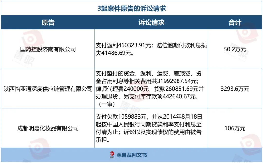 青眼从中国裁判文书网了解到,2017年起,国药控股济南有限公司、陕西怡亚通深度供应链管理有限公司、成都明嘉化妆品有限公司相继起诉曼秀雷敦(中国)药业有限公司(下称曼秀雷敦中国)及下属广州/成都分公司,要求曼秀雷敦公司支付返利、欠款、货款等费用,合计索要费用逾3300万元。