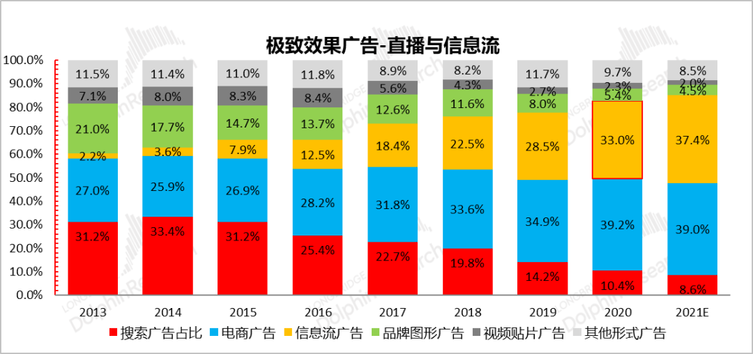 2)2020年初上一波疫情当中广告结构变化来看:上一波疫情当中,广告主们在不确定性中寻找确定性的路径就是收紧预算,把仅有的预算更多投向了信息流这种极致效果广告中。