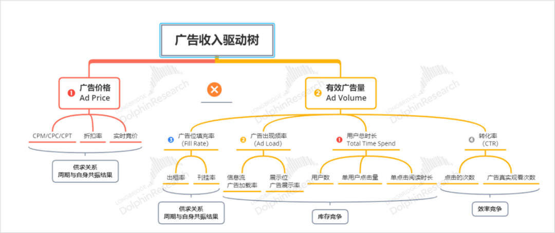 海豚君很早在阐述互联网广告的逻辑时提到过广告的里子和面子,面子上是海量的用户时长所构成广告的库存供应,而广告收入的实现,除了供应还有“里子”需求的问题,以及供需之间通过高效转化的供需匹配。