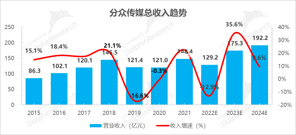 a. 保守预期:假如2022年是广告的“失去的一年”,分众广告收入同比增速从2021年22%的增长掉入2022年13%的下跌后,2023年恢复,到2024年进入正常的增长状态。