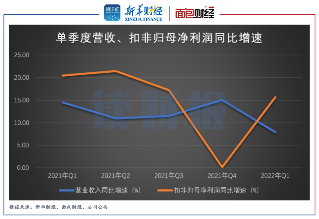 2022年一季度,通化东宝分别实现营收、归母净利润、扣非后归母净利润8.87亿元、8.31亿元和3.89亿元,同比分别增长7.85%、146.90%和15.63%。报告期内,公司的营收增速相比前几季度明显放缓,但扣非后归母净利润增速环比回暖,也大幅高于同期的营收增速。