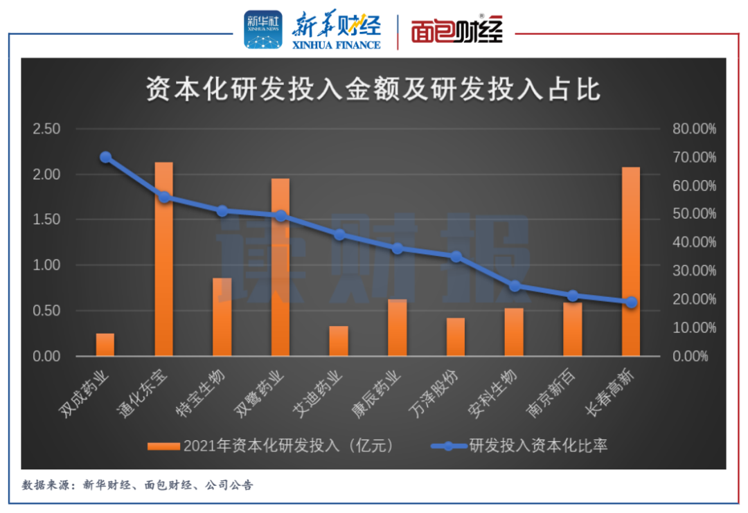 但另一方面,通化东宝研发投入资本化比例明显较高。数据显示,公司2021年合计3.80亿元的研发投入中,资本化的金额为2.13亿元,占比达56.11%。