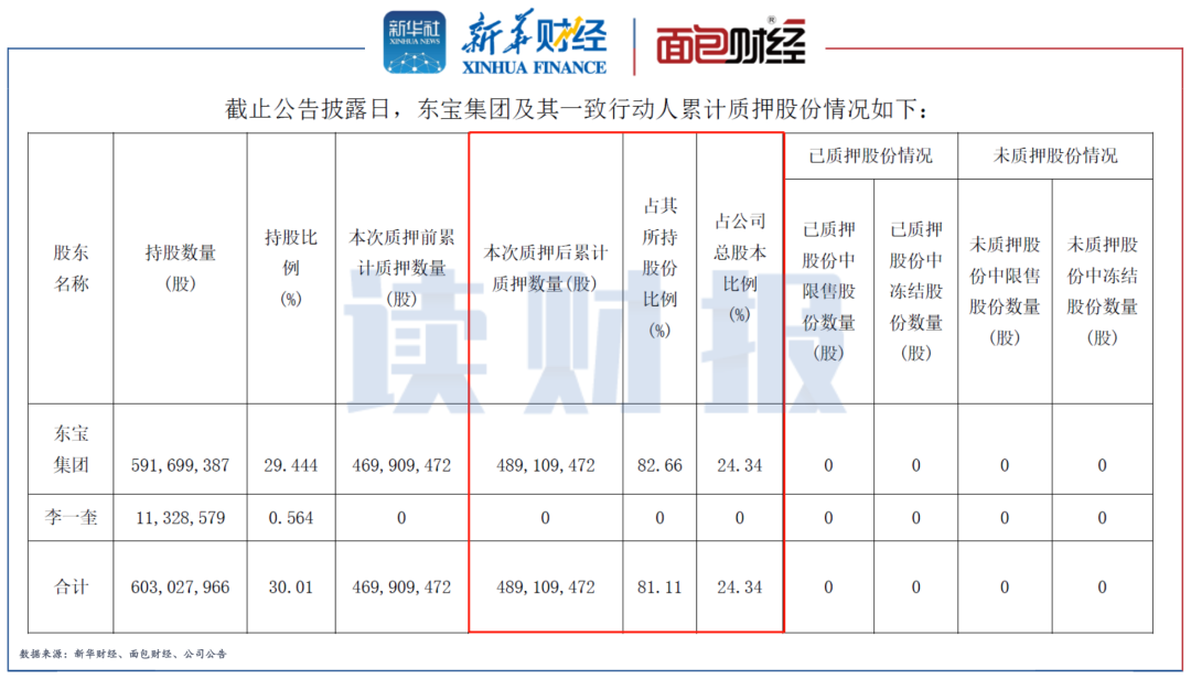 2022年3月的质押公告显示,通化东宝的控股股东东宝集团及其一致行动人合计持有公司股份约6.03亿股,占公司股份总额的30.01%。东宝集团及其一致行动人累计质押4.89亿股,占其所持公司股份总额的81.11%,占公司股份总额的24.34%。