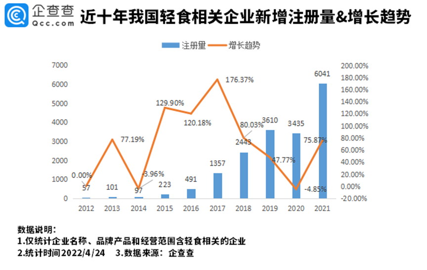 据企查查数据显示,我国现存“轻食”相关企业超过1.3万家,2021年新增相关企业超过6千家,同比增长75.87%,近十年来相关企业注册量整体呈增长趋势。