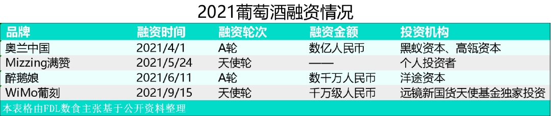 在2021年,低度酒赛道迎来投资热风口之时,据FDL数食主张统计,葡萄酒领域仅有奥兰中国、醉鹅娘、WiMo葡刻以及Mizzing满赞4家品牌收获融资。