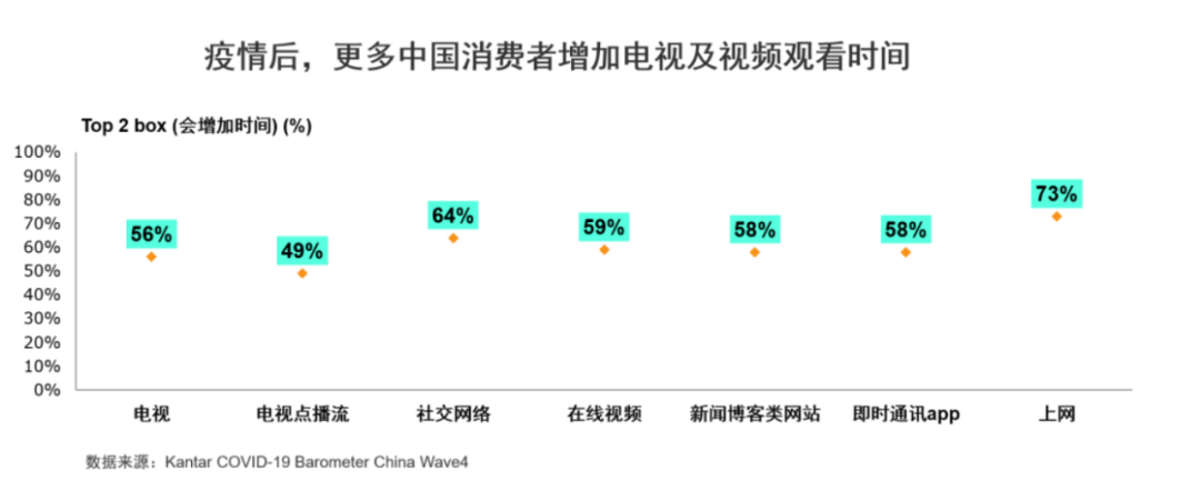 同时,根据凯度的追踪数据可见,随着人们的居家时间不断增加,持续推动消费者对电视,在线视频等的使用增加。