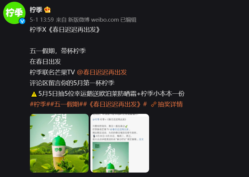 柠檬茶品牌柠季,针对五一假期,联名芒果TV发起互动有奖活动。同时,5月1日当天,柠季山东首店在青岛麦凯乐正式开业,开业当天现场生意火爆,引发当地媒体报道。