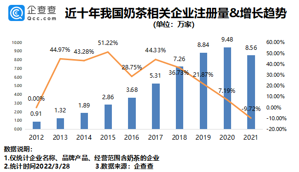 企查查数据显示,奶茶相关企业在2018年、2019年、2020年新增企业7.26万家、8.84万家、9.48万家,2021年新增8.56万家。