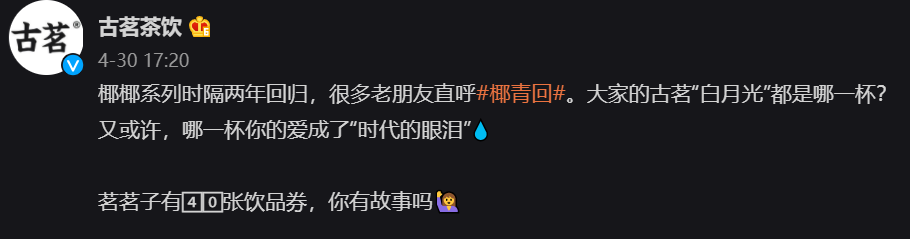 再看古茗,其在“五一”前夕宣布椰椰系列时隔两年回归。椰椰系列的回归,既迎合了当下的椰饮风潮,又契合夏天清爽饮品的调性。