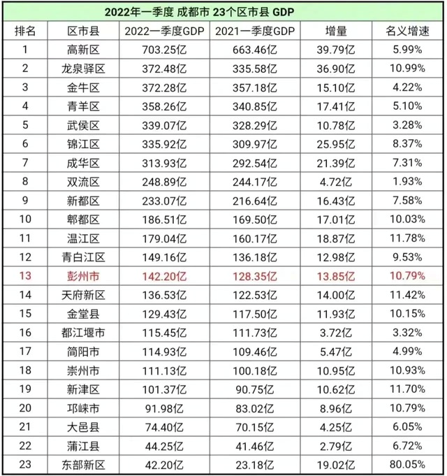 2022年一季度成都各区市县GDP排名中,双流区以248.99亿排名第八,但1.93%的增速却是全成都倒数第一,可见受疫情的冲击影响是明显的。东部新区则以80.05%的增速位列第一。作为同样将航空经济作为支柱产业之一的区域,可见其潜力仍在,只是需要更新的“机遇”作为刺激。