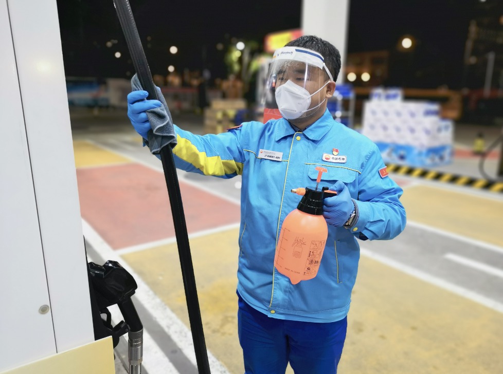 3月28日,站里只剩下苏国明和另外3名驻站员工,加油的车辆只剩下防疫保障用车。为了保证安全,苏国明将4个人划定在不同的区域,避免同处一个室内空间。看到防疫车辆,苏国明总是第一个冲上前去,为车辆消杀、加油,核对车主绿码、核酸情况和通行证,在户外采用移动POS机进行无接触支付。他每天都认真叮嘱员工穿戴好防护服、面罩等,一天3次做好场地消杀。