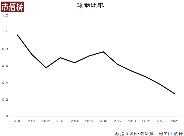 截至2021年末,步步高的流动资产只有不到50亿元,流动负债却高达183.26亿元,流动比率极低,只有0.27。