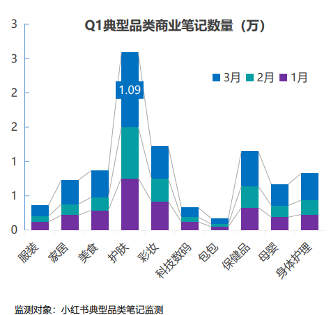从艺恩星数《Q1小红书典型品类商业笔记》的监测数据来看,小红书是当之无愧的护肤与彩妆领域“种草沃土”,2022年第一季度护肤类的营销投放数量远超其他品类。