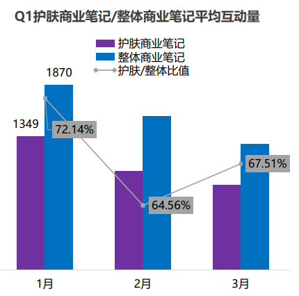 小红书品牌投放榜单TOP10显示,美妆类品牌仍为发力较强品牌。今年1月,护肤商业笔记占总体商业笔记的72.14%,在2月投放数量的略微下滑后,3月投放量“回升”,占到了整体商业笔记的67.51%。