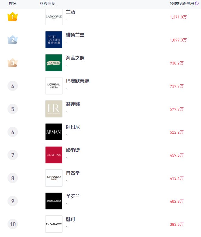 艺恩星数最新4月数据显示,以欧莱雅、雅诗兰黛为代表的外资集团依然是“种草”主力金主,和娇韵诗、伽蓝四大公司包圆了美妆品牌小红书投放费用的TOP10。其中,兰蔻投放费用居于首位,为1271.8万元,雅诗兰黛、海蓝之谜紧随其后,欧莱雅集团旗下巴黎欧莱雅、赫莲娜、阿玛尼、圣罗兰YSL的投放费用也跻身前十。值得关注的是,本土企业伽蓝旗下自然堂以413.4万元位列第八。