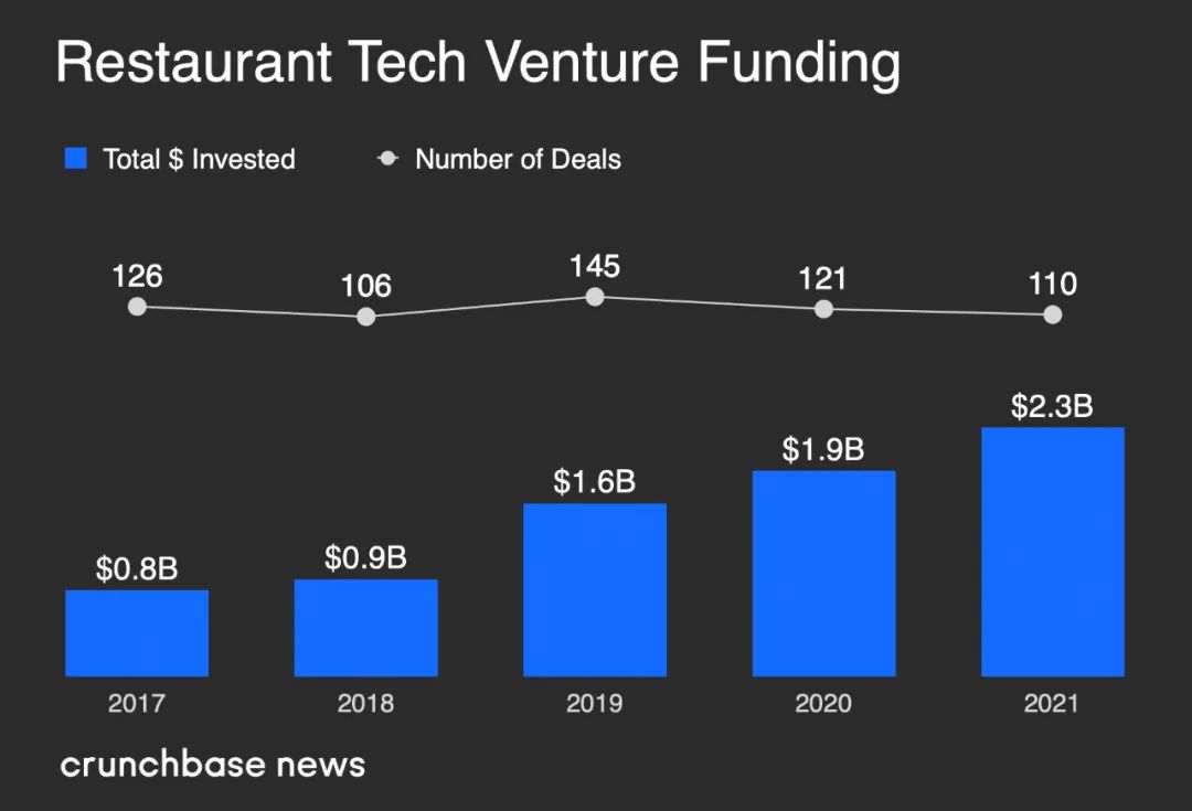 面临着这样的挑战,餐饮科技肩负起了节省人力成本和提升运营效率的责任,多个领域出现了初创公司帮助餐馆度过了最难过的时间段,也潜移默化的将数字化的新风吹进了这一“老古董”行业,资本随之涌进这一赛道,餐饮科技类公司的融资从2017年的8亿美元增长到了2021年的23亿美元。