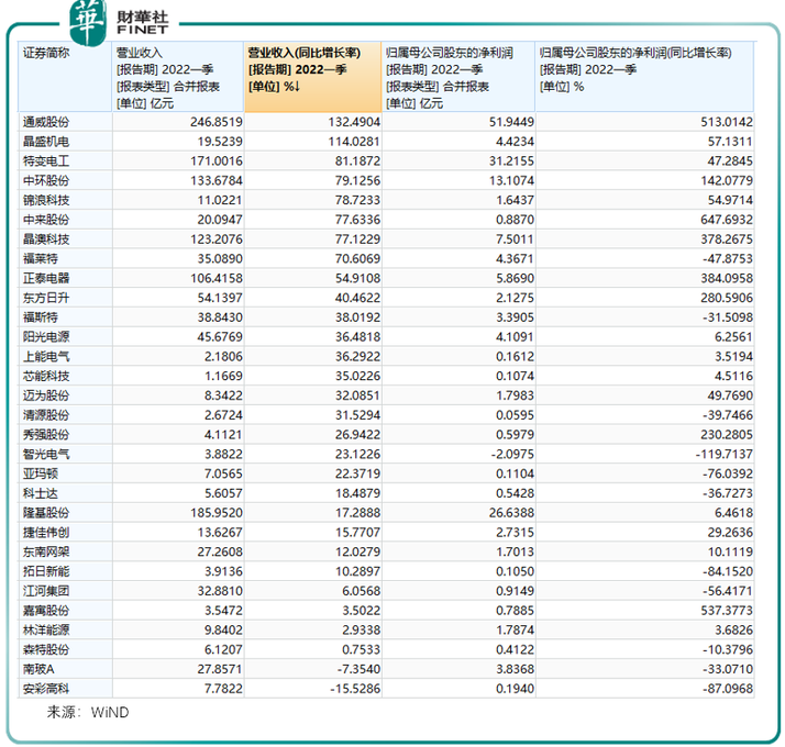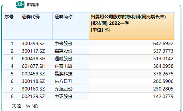 增速超过140%的企业有中来股份、嘉寓股份、通威股份、正泰电器、晶澳科技、东方日升、秀强股份、中环股份。