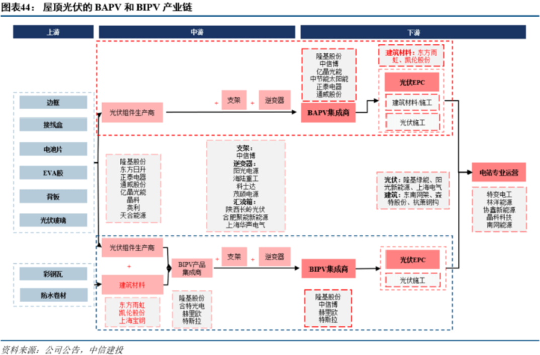 此外,BIPV等新技术还拉长光伏产业链,汇集建筑、建材等多方参与者,包括东南网架、森特股份、杭萧钢构等。