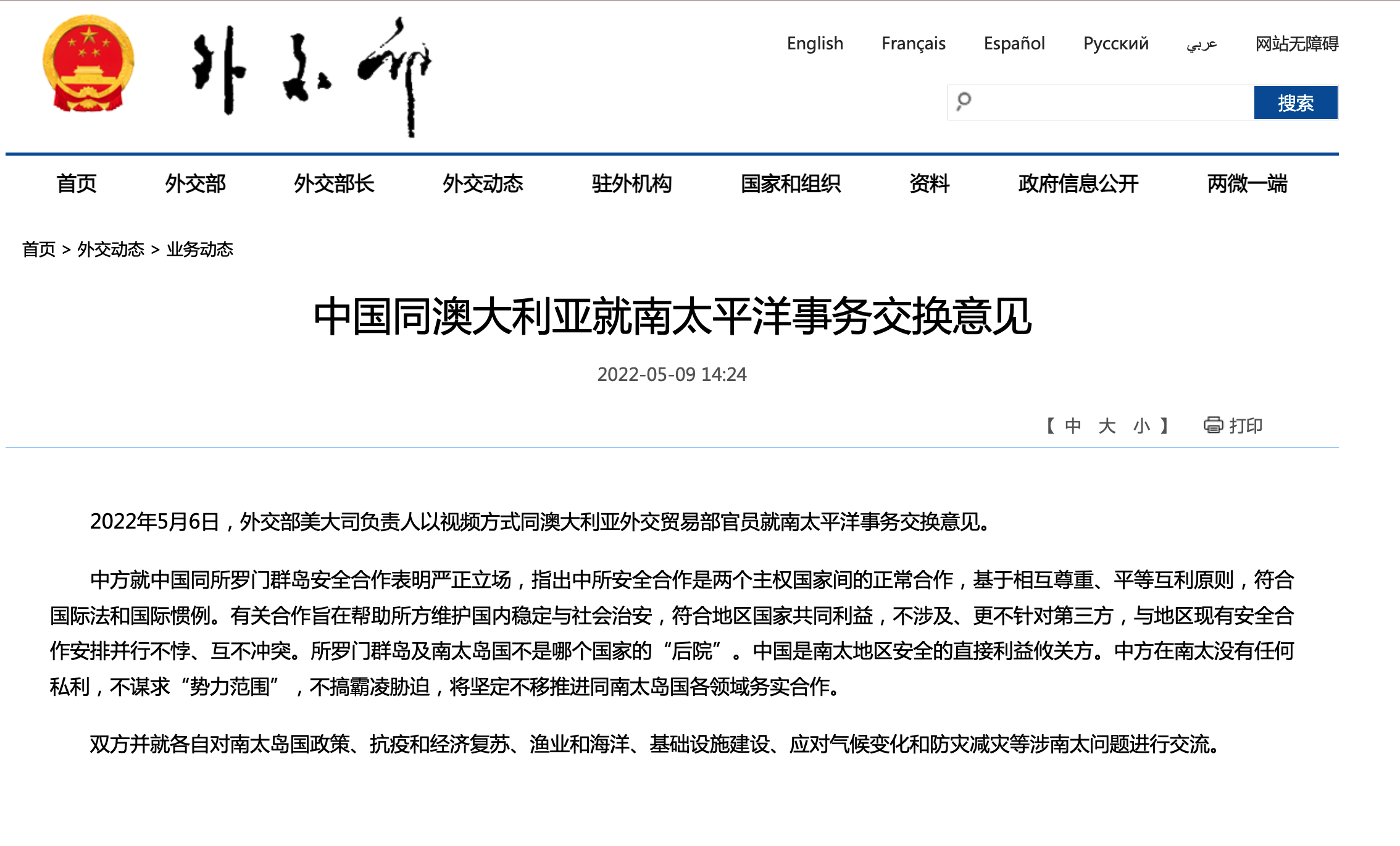 据外交部网站5月9日消息,5月6日,外交部美大司负责人以视频方式同澳大利亚外交贸易部官员就南太平洋事务交换意见。