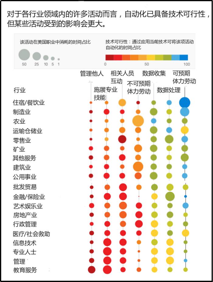麦肯锡研究发现,美国职场中约有1/5的时间被花在体力劳动或在可预期环境中操作机械上,约有78%的上述工作内容将通过现有技术实现自动化。在只考虑技术的情况下,住宿餐饮业、制造业和零售业因大量涉及这类工作内容而成为最容易被自动化的行业。