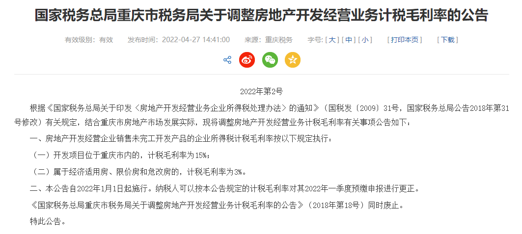 4月27日,国家税务总局重庆市税务局发布了关于调整房地产开发经营业务计税毛利率的公告。