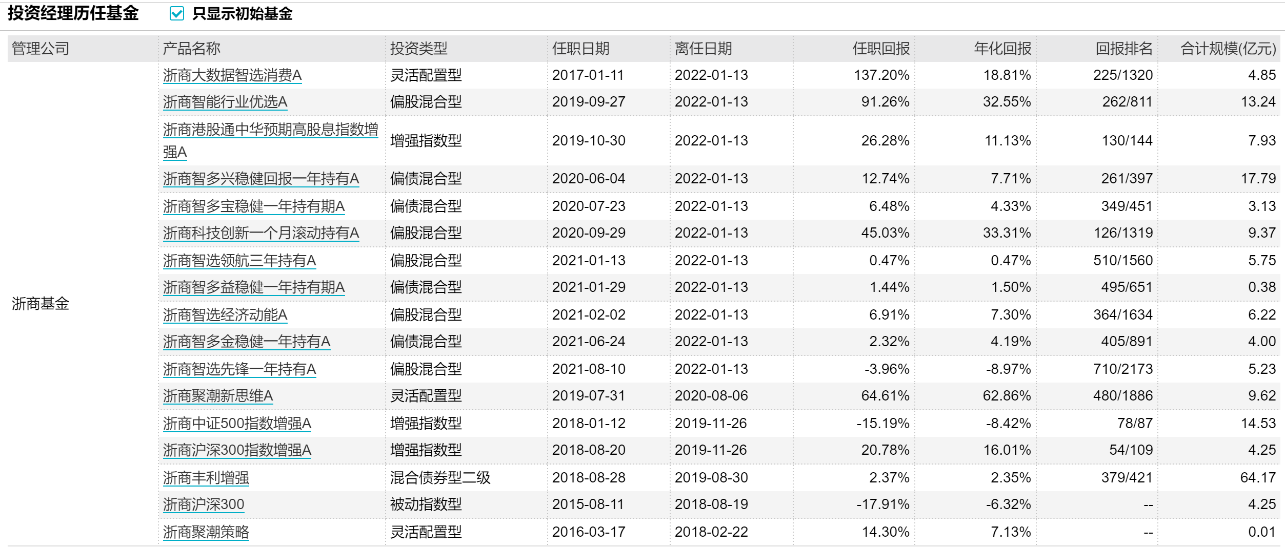 Wind数据显示,在浙商基金就职期间,查晓磊曾管理过17支基金,除浙商智选先锋一年持有A、浙商中证500指数增强A、浙商沪深300等3支产品任职回报为负,其余均为正收益。其代表作浙商大数据智选消费A任职5年总回报137.20%,年化回报18.81%,今年1月正式交由白玉打理。