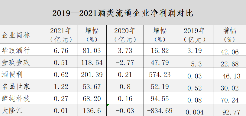 净利方面,1919、酒便利、大隆汇均实现翻倍增长,其中,酒便利净利增幅超过200%,而华致酒行则以6.76亿元的净利润位居第一。