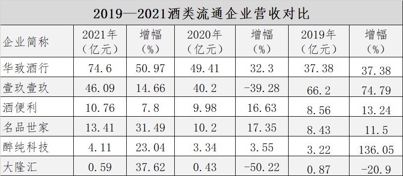 对比2019年业绩来看,华致酒行、名品世家、酒便利、醉纯科技等几家企业的2021年营收较2019年分别实现增长50%、37.14%、25.70%和27.64%。其中,华致酒行2021年的营收更是比2019年翻了近一倍。另外,1919和大隆汇的营收仍未恢复至2019年水平,这表明疫情的影响仍在。