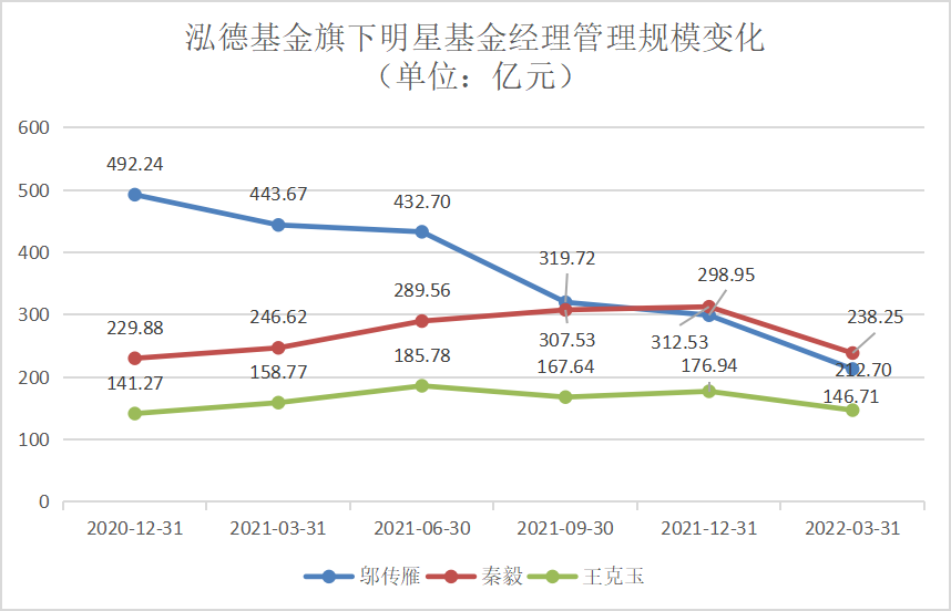 事实上,自2020年末以来,泓德基金管理规模就持续下滑,从上千亿元规模跌至当前的七百多亿元。泓德基金各类产品规模均出现下降,权益基金成为重灾区。在此背后,其知名基金经理在管规模明显下降,秦毅和邬传雁仅在一季度规模合计下降160亿元。