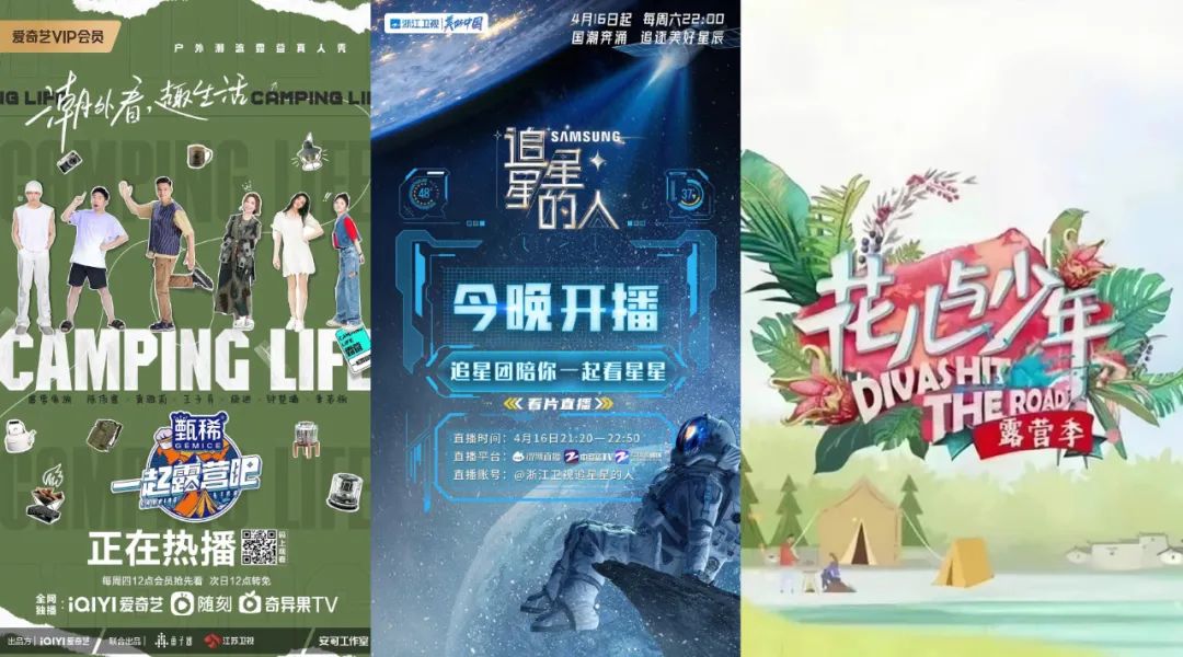 爱奇艺反应最迅捷,赶在小长假前的4月28日开播《一起露营吧》,猛吃了一口五一露营热红利。上个月,浙江卫视则抢先开跑了一档自驾露营青春慢综艺《追星星的人2》。而时隔五年,芒果老牌IP《花儿与少年》第四季回归,打出「露营季」的全新title,杨幂、刘敏涛、时代少年团-丁程鑫等嘉宾的录制路透讨论度奇高。
