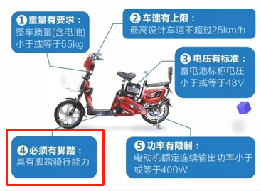 电动自行车有脚踏骑行功能,而电动轻便摩托车和电动摩托车则没有脚踏骑行装置。示例图片▼