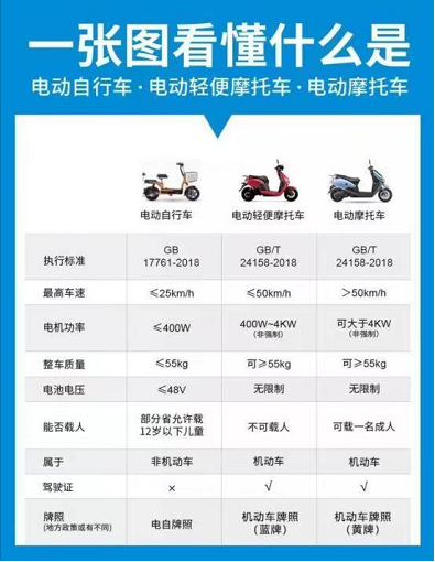 就最大设计车速来说,电动自行车不超过25km/h,电动轻便摩托车不大于50km/h,电动摩托车大于50km/h。就整车质量来说,电动自行车小于或等于55kg,电动轻便摩托车和电动摩托车大于或等于55kg。