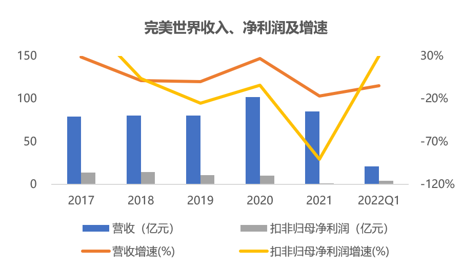 21年,完美世界交出近五年最差成绩单,营收和净利润双降,业绩下滑主要源于业务条线调整。