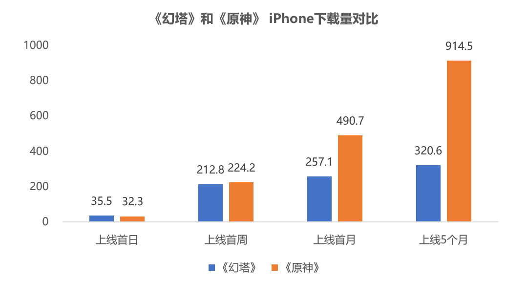 上线前五个月,《幻塔》iPhone端下载量和收入分别只相当于《原神》的35%和28%。