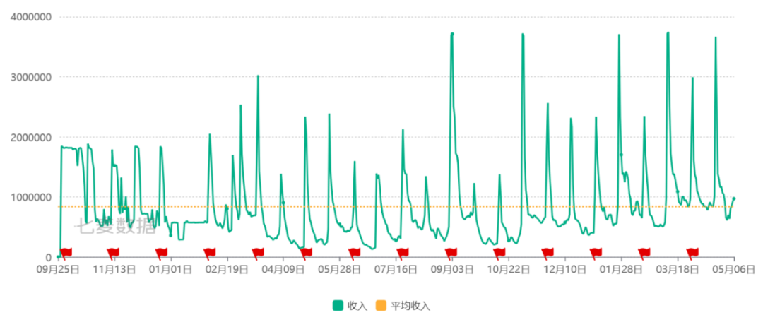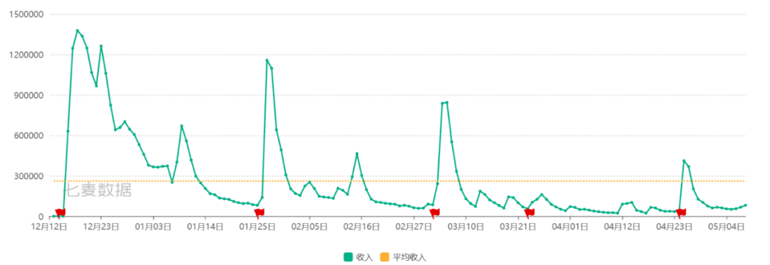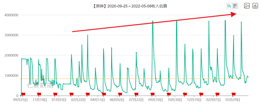 而《原神》每隔20天也会出现一波收入高峰,与《幻塔》不同的是,《原神》收入高开高走,小高峰维持在较高水平。这主要源于《原神》抽卡的玩法,主要的氪金点在于抽取不同的角色、武器,卡池20天更新一次。