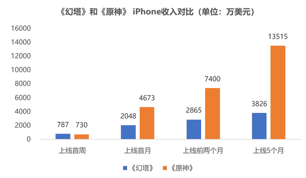 和《原神》同期收入对比,《幻塔》上线首周iPhone收入甚至高于《原神》,但从第二周开始,《幻塔》被《原神》远远甩开。