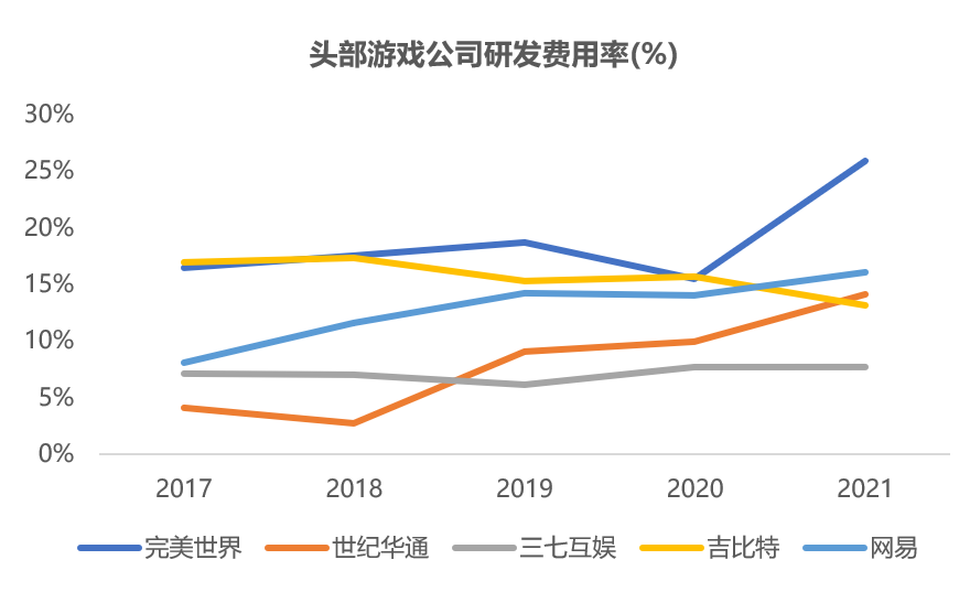 从研发费用率来看,21年完美世界研发费用率达26%,处于行业第一梯队,远高于三七互娱、世纪华通、吉比特等头部游戏厂商。