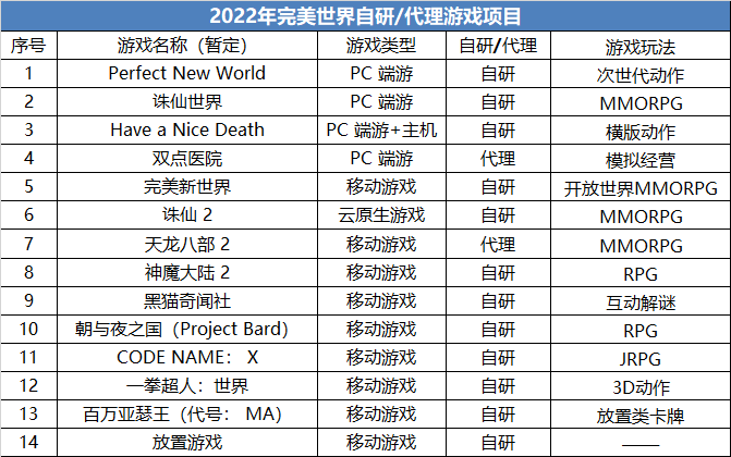 从产品储备来看,22年完美世界预计发行14款游戏,包括12款自研和2款代理,涵盖 MMORPG、RPG、卡牌、模拟经营、动作、互动解谜等多种类型,其中传统的MMORPG游戏占比只有3成。