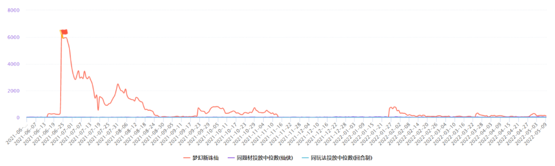 相比之下,《梦幻新诛仙》投放持续时间远超《战神遗迹》,但也主要集中于21年6-8月。单论持续投放时间,远不及同期其他游戏。