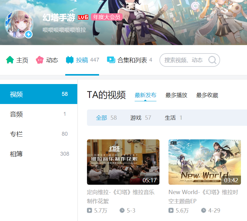 B站是二次元游戏营销的主战场。截至目前,《幻塔》官方账号在B站拥有85.7万粉丝,一共发布了58个视频,获得超123.7万点赞。在游戏正式上线前,《幻塔》的更新频率基本保持在月更。