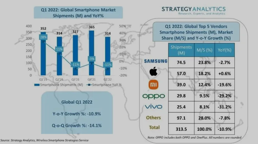 值得注意的是,在各大厂商的角逐赛中,三星和苹果的地位依旧稳固,分别占据24%和18%的市场份额。其中苹果还获得了自 2013 年以来最高的第一季度市场份额,iPhone 13 系列和 iPhone SE都受到消费者的欢迎。