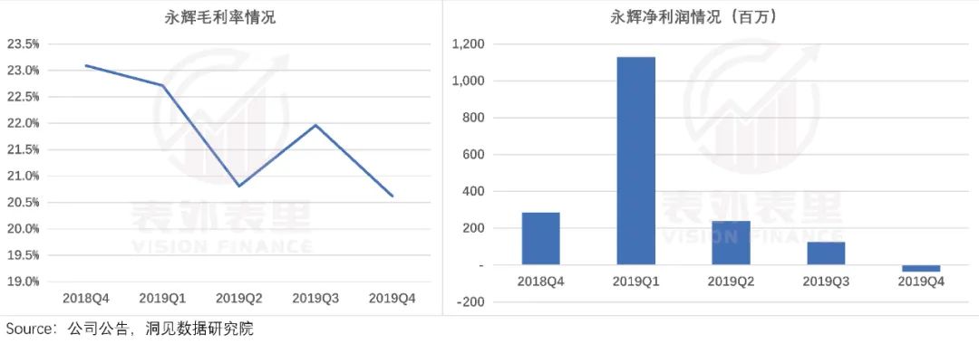 如下图,2019Q4永辉超市就出现了亏损情况——毛利率下滑明显,净利润由正转负,亏损达3700万。