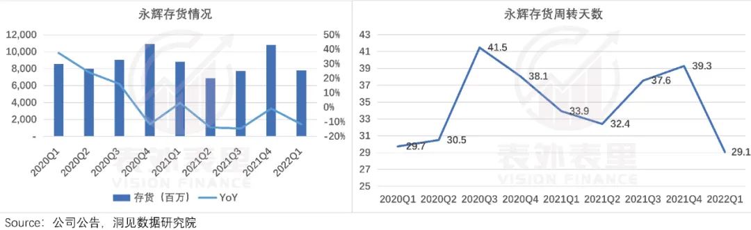 此外,降库存举措也反馈出运营效率提升。如下图,2021年永辉各个季度末的存货均同比下降,2022Q1存货周转天数也显著降低。