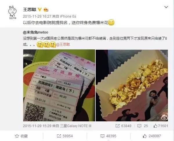 “以后你去电影院就提我名,送你终身免费爆米花”,王思聪的一句话,竟然获得229121个赞,这句话究竟是王思聪的玩笑话还是真心话,我们并不清楚,但是王思聪通过微博与用户的这种调侃式的互动,很自然地为万达影院打了一个营销广告。